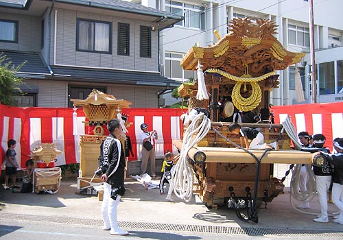 市民会館前で休憩中の鍛冶町です。子供地車も一緒です。